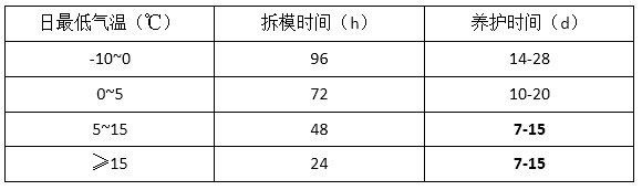 具體時間參見“拆膜和養護時間及環境溫度的關系表”: